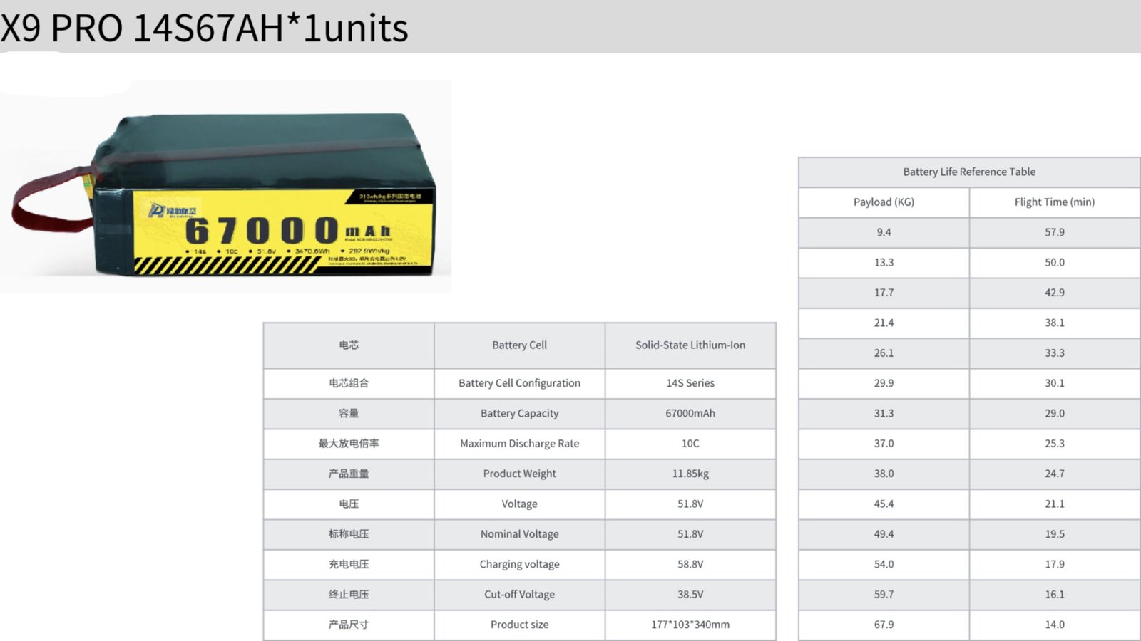 云航科技(苏州)有限公司X9 PRO 14S67AH电池组,通过67000mAh超高容量、14S系列架构和10C放电倍率的技术组合,正在重塑工业级无人机的动力标准。无论是需要长续航的测绘作业,还是追求高功率输出的重负载应用,这款黑绿色配色的专业电池组都能提供超出预期的性能。随着固态电池技术的不断发展,其能量密度将不断突破行业边界。